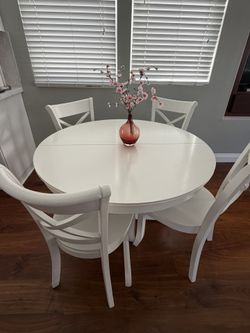 IKEA Extendable Round Dining Table + Crate & Barrel Chairs – White$750San Diego, CA