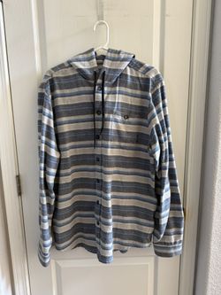 Men’s Long Sleeve Billabong Baja Flannel Button Up Blue and Gray Striped Hooded Shirt - Size Large $30Roseville, CA