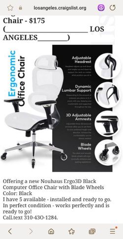 Nouhaus Ergo3D Ergonomic Office Chair - Rolling Desk Chair with 4D Adjustable Armrest, 3D Lumbar Support and Blade Wheels - Mesh Computer Chair, Offic$175Los Angeles, CA