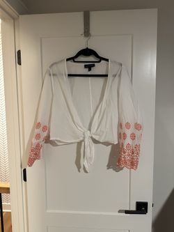 Lane Bryant Size 14/16 Tie Front Eyelet White Overpiece Cropped Top Long Sleeves. Coral embroidery$25Streamwood, IL