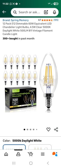 12 Pack E12 Dimmable 60W Equivalent LED Chandelier Light Bulbs, 4.5W Clear 5000K Daylight White 500LM B11 Vintage Filament Candle Light$25Cape Coral, FL