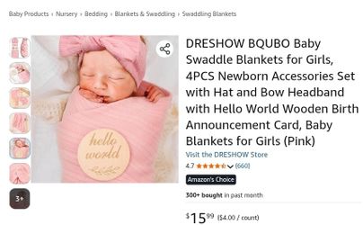 DRESHOW Pink Baby Swaddle Set w Hat, Bow Headband & Hello World Cards$15Sacramento, CA