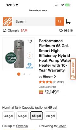 Rheem 65G Hybrid Water Heater $1,900Lacey, WA