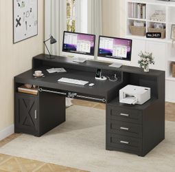 Farmhouse Computer Desk with Drawers, 65'' Home Office Desk with Power Outlets, Storage Cabinet and Printer Stand, Study Writing Desks with Long Monit$125El Monte, CA