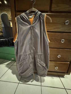 Grey sleeveless hooded vest with orange interior lining and striped arm cuffs$30Laud Lakes, FL
