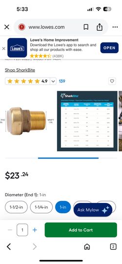 SharkBite push-to-connect PVC transition fittings $110Concord, NC