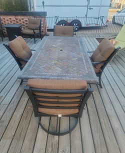 Large Rectangle Heavy Stone Patio Table With 2 Swivel And 2 Standard Chairs And 8 Cushions With Storage Box. All Aluminum Framing$900Morton Grove, IL