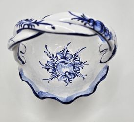 Vintage Portuguese Pottery White Handled Basket Bowl Hand Painted Blue Florals For Macy's 1988$15Miami, FL