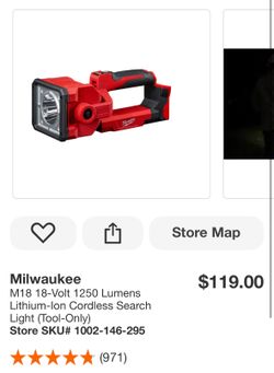 Milwaukee M18 18-Volt 1250 Lumens Lithium-lon Cordless Search Light (Tool-Only) Store SKU# 1002-146-295$100Everett, WA