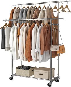 Simple Trending Double Rod Clothing Garment Rack, Rolling Clothes Organizer on Wheels for Hanging Clothes,with 4 hooks, Chrome$38Chino, CA