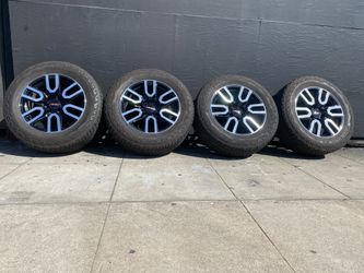 Set 2025 20” GMC AT-4 factory wheels w Bridgestone 275/60/20 Dueler AT tires, 80% tread, 6x5.5 bolt Pattern, sell all 4 $1200.00 cash$1,200Pomona, CA