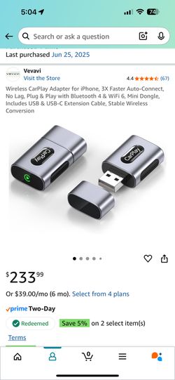 Wireless CarPlay Adapter for iPhone, 3X Faster Auto-Connect, No Lag, Plug & Play with Bluetooth 4 & WiFi 6, Mini Dongle, Includes USB & USB-C Extensio$40Los Angeles, CA
