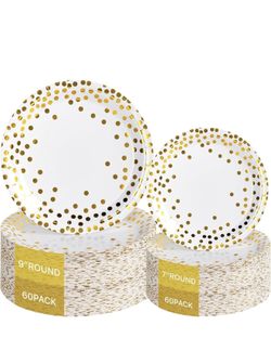 120PCS White Paper Plates, Disposable Gold Paper Plates, 60pcs Dinner Plates 9",60pcs Dessert Plates 7", Party Plates with Golden Dot for Birthday $12Monrovia, CA