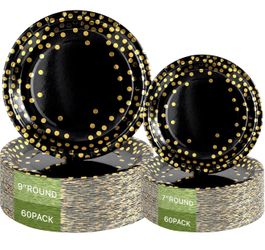 120PCS Black Paper Plates, Black and Gold Paper Plates, 60pcs Dinner Plates 9",60pcs Dessert Plates 7", Disposable Graduation Plates with Golden Dot f$15Sierra Madre, CA