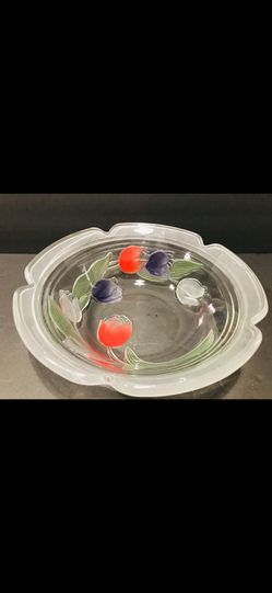 Tulips Clear Glass Salad Bowl 11” Beautiful clear bowl ,large, with red and purple tulips on clear glass$35Boca Raton, FL
