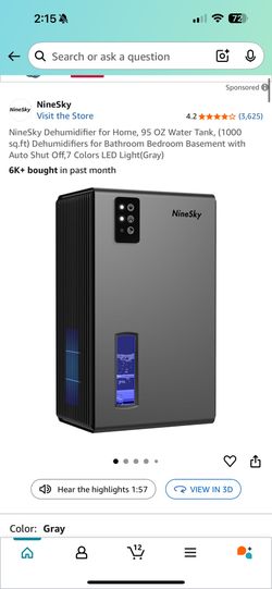 NineSky Dehumidifier for Home, 95 OZ Water Tank, (1000 sq.ft) Dehumidifiers for Bathroom Bedroom Basement with Auto Shut Off, 7 Colors LED Light(Gray)$45Chicago, IL