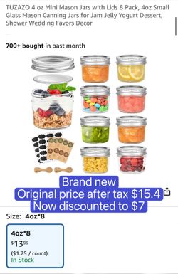 4 oz Mini Mason Jars with Lids 8 Pack, 4oz Small Glass Mason Canning Jars for Jam Jelly Yogurt Dessert, Shower Wedding Favors Decor$7San Gabriel, CA