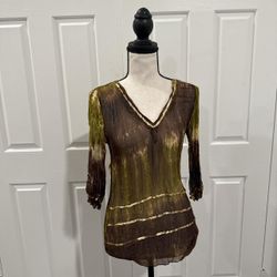 Like New | Earthy Sheer Crinkle Half Sleeve V-Neck Top Blouse with Gold Color Sequin Detail$15Corona, CA