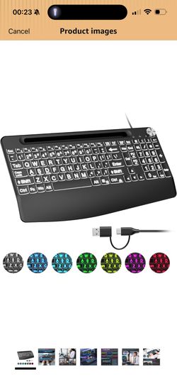 USB C(Type C)/USB A Wired Large Print Keyboard with Quiet Scissor Keys,7 Colored Backlits ,Phone Holder &Volume Knob and Wrist Rest, Full Size Keyboar$25Irvine, CA