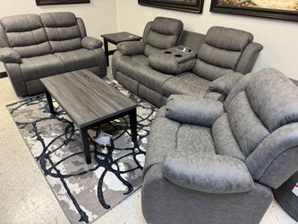GRAY LEATHER SOFA, LOVESEAT AND CHAIR 3 PIECE MANUAL RECLINER COUCH SET $1,200Dallas, TX