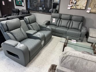 GRAY LEATHER POWER RECLINER SET SOFA LOVESEAT SET WITH SPEAKER SYSTEM $1,700Dallas, TX