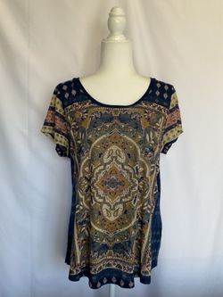 Lucky Brand Boho Top Womens Large Navy & Gold Mixed Print Casual Tee Stretch$19Stockton, CA