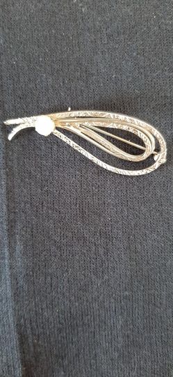 Silver tone brooch with intricate scroll design & pearl.$15Chicago, IL