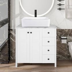 32" White Bathroom Vanity with Marble Texture Top and 4 Drawers, Modern Standing Pedestal Cabinet with White Ceramic Sink$240Rosemead, CA