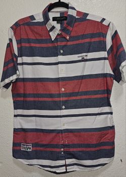 Design: Wide horizontal stripes in a tri-color palette (navy blue, red, a$25Hazard, CA