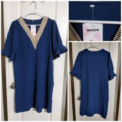 Shift dress in blue with a tan crocheted V-neck and short, ruffled sleeves Size L$20Webberville, TX