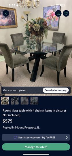 Round glass table with 4 chairs ( items in pictures Not included)$400Mount Prospect, IL