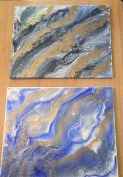 Home Decor - Set of Two Handmade Pour Paintings Blues with Metallic Gold & Epoxy Finish$25Bedford, TX