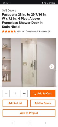 New Pasadena 28 in. to 29 7/16 in. W x 72 in. H Pivot Alcove Frameless Shower Door in Satin Nickel$250San Diego, CA