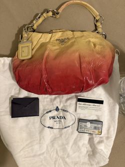 Prada Vernice Sfumata shoulder bag in red and yellow gradient patent leather.$450Pompano Beach, FL