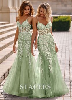 Sage Green Trumpet/Mermaid V Neck Tulle Sweep Train Prom Dress with Appliqued Sequins Glitter$30Maple Valley, WA