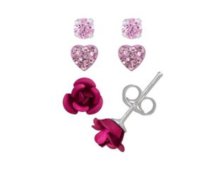 Sterling Silver Pink Crystal Heart, Pink CZ and Red Rose Stud Earrings 3 Pair Set