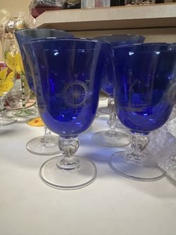 Vintage Cobalt Blue Nautical Gold Design Water/wine Goblets with Clear Twisted Stems. 9 Glasses Total $80Mesa, AZ