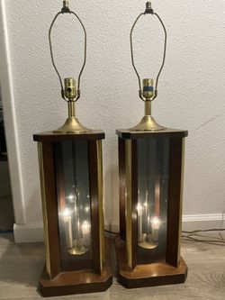 Vintage Pair Lantern Table Lamps Smoked Glass Wood Brass 3-way Nightlight Base$400Modesto, CA