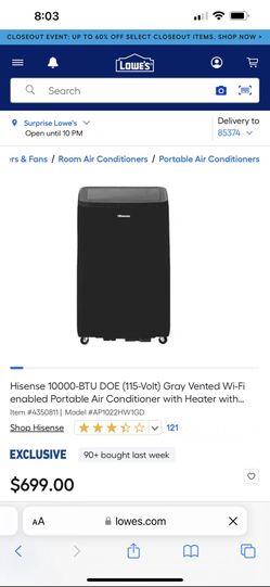 Hisense 10000-BTU DOE (115-Volt) Gray Vented Wi-Fi enabled Portable Air Conditioner with Heater with $380Chandler, AZ
