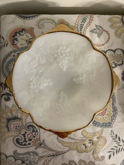 Vintage Anchor Hocking Milk Glass Raised Bowl with Gold Trim Grape Leaves Design$10Warwick, RI