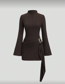 SHEIN BAE Women's Slim-Fitting Long-Sleeved High-Neck Mini Dress With Ruffled Hem, Coffee Color, Suitable For Layering, Dating Or Commuting In Autumn $15Las Vegas, NV