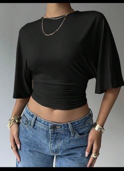 Aloruh Women's Solid Color Round Neck Batwing Short Sleeve Pleated Cropped Casual T-Shirt, Black Tops Formal Occasion, Special Occasion Re-Wearable Bu$10Las Vegas, NV