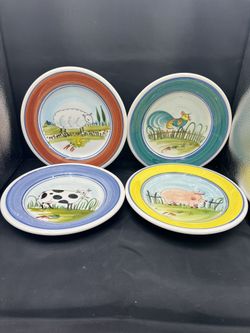 Four (4) Handpainted / Artist Signed Farm Animals Plates Pig Sheep Cow Rooster/G$40Booneville, MS