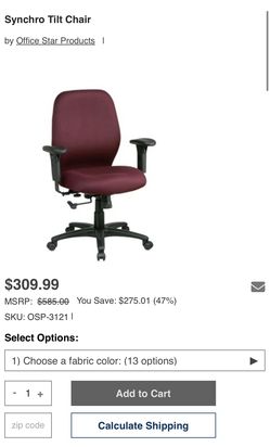 Comfy Office Star Synchro Tilt Chair. Has black mesh back, maroon fabric seat. All wheels roll smooth. Adjusts height and tilt. Good for home office o$45Blythewood, SC