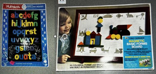 Vintage Child Guidance Magnetic Basic Forms Board. Missing Forms Magnets. Includes New Playskool Letters Board And Magnet Set. $35Beavercreek, OR