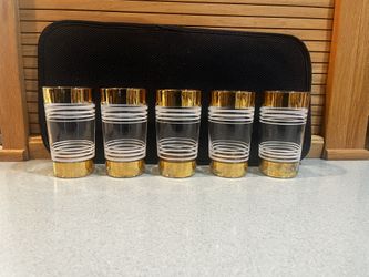 Five Vintage White Striped Glasses With Gold Band Top And Bottom. 5” X 2.75” Top. 2.25”On Bottom.$10Beavercreek, OR