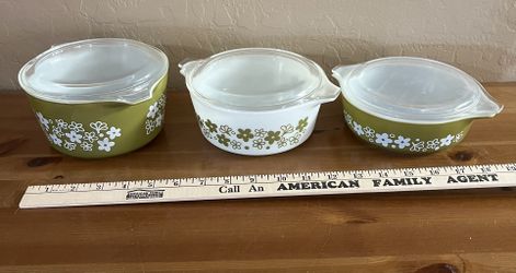 Pyrex Green & white Spring Blossom Casserole Dishes With Lids$85Maricopa, AZ