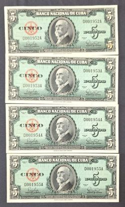 4 Billetes 1960-UNC-Banco Nacional De Cuba 1960-serie Consecutiva$55Clermont, FL