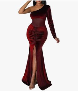 Women One Shoulder Velvet Dress Ruched Bodycon Maxi Cocktail Party Holiday Dress Formal Evening Gowns with Slit Burgundy L$30Pleasant Hill, IA
