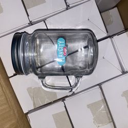 clear glass mason jar mug branded with a "Flavcity Café" logo and featuring a black screw-top lid. $50Anaheim, CA